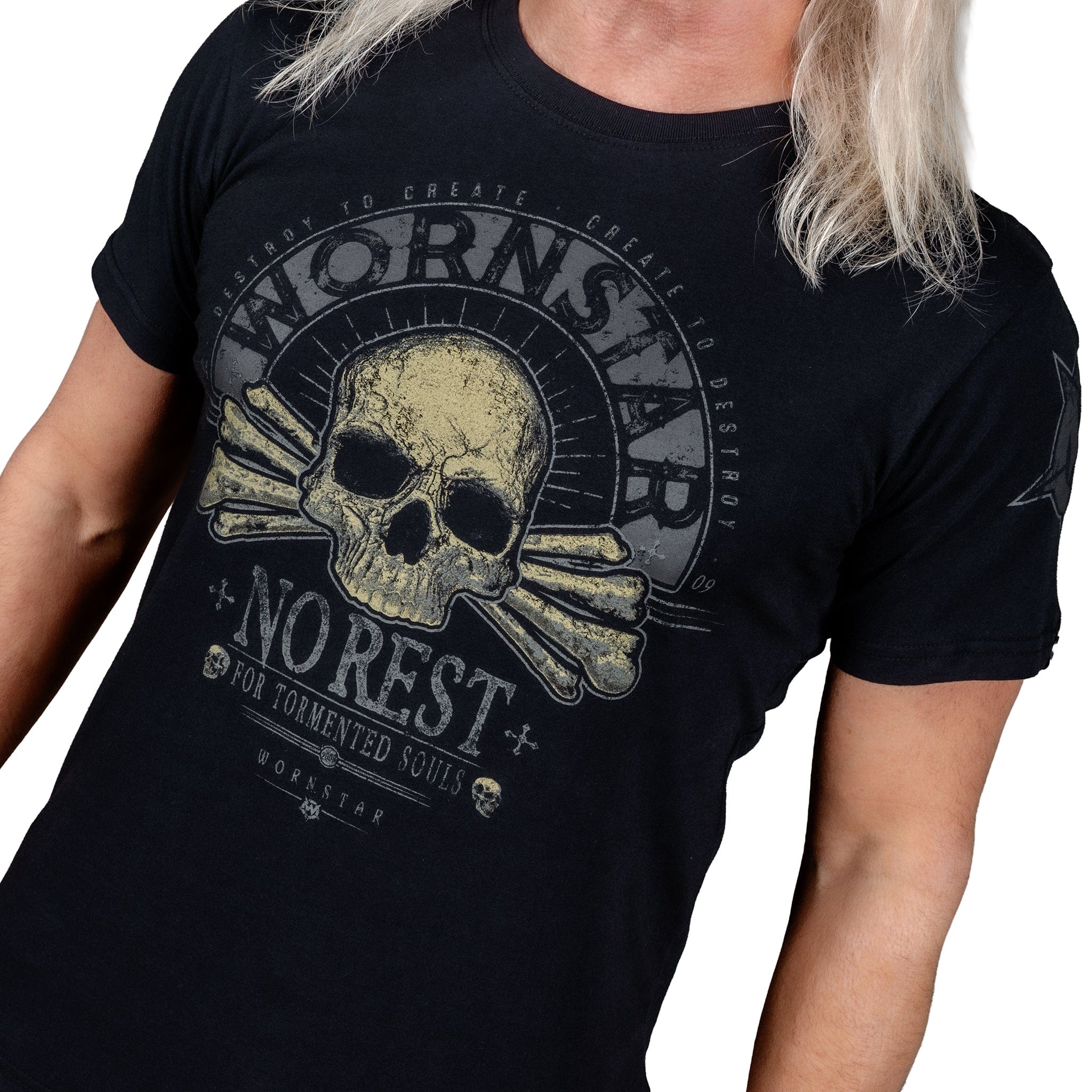 No rest for tormented souls, the Wornstar No Rest T-shirt features super soft pre-washed cotton with distressed Wornstar No Rest graphics. Each one is printed with soft inks. As part of the Wornstar Artist Asylum Series, each shirt is hand made of 100% cotton. Slimmer, modern cut fashion tee.