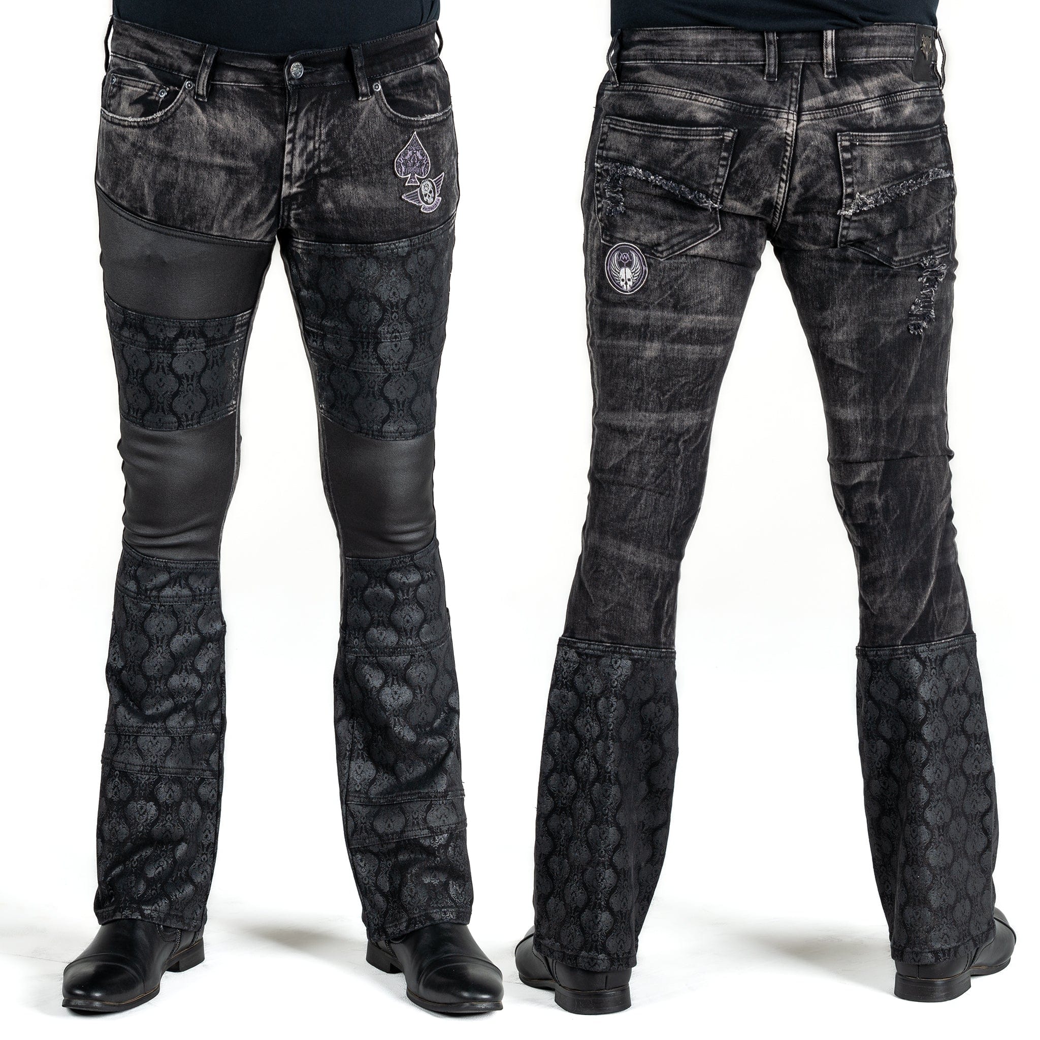 • Printed black-on black brocade pattern and waxed denim accents